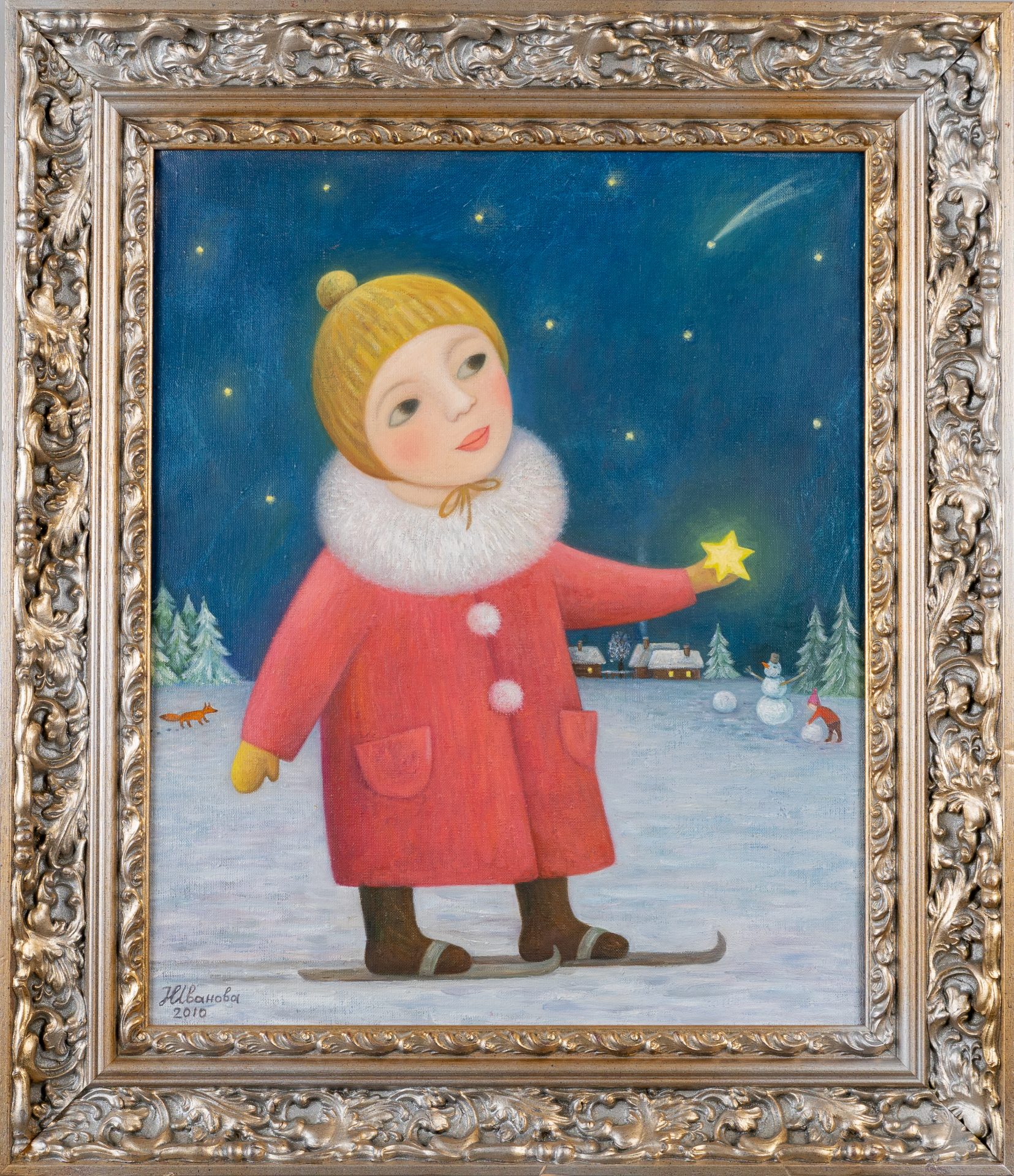 Її погляд спрямований вгору, де в нічному небі летить зірка, що падає, немов знак виконання бажань. Фон створює відчуття затишку та тиші зимової ночі – дерева закутані снігом, далеко горять вогні будинків. Ця робота викликає почуття тепла, радості та віри в чудеса, нагадує про безтурботне дитинство, коли світ був сповнений чаклунства.