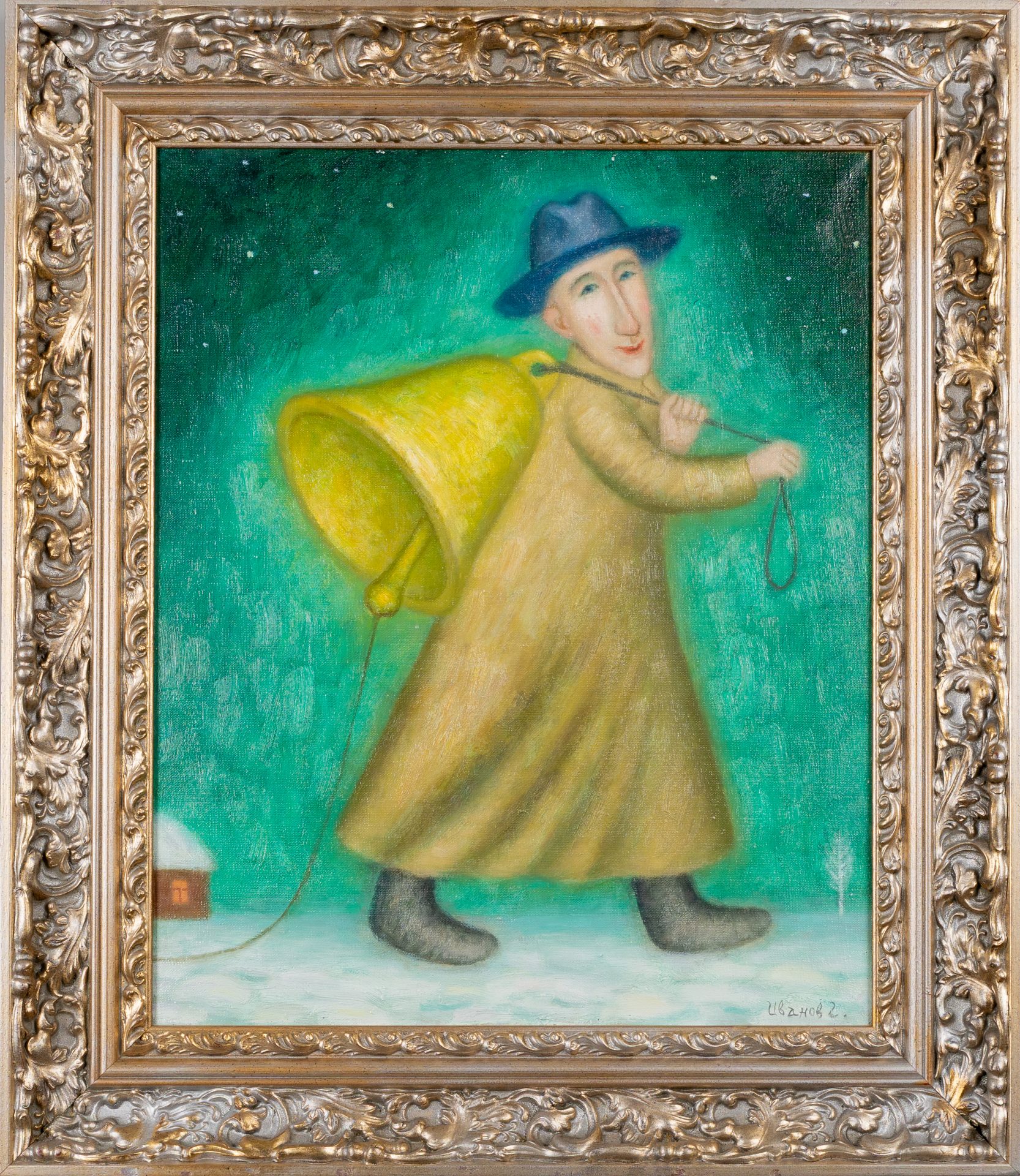«Різдвяний дзвін», несе у собі глибший, філософський зміст. На ній зображено людину в довгому зеленому пальті і синім капелюсі, що несе на спині великий дзвін. Його поза, вираз обличчя і темне тло створюють атмосферу задуму і навіть печалі. Можливо, ця людина символізує вісника Різдва, яке несе людям світло та надію. Дзвін тут – символ пробудження, заклик до радості або навіть нагадування про духовні цінності свята. Картина викликає почуття задуму, легкого смутку, але водночас – надії та очікування чогось важливого. Обидві роботи поєднує відчуття чародійства, тиші зимової ночі та внутрішнього світла, що походить від персонажів. Вони змушують задуматися про сенс Різдва – не лише як свята, а й як стан душі, наповнений теплом, очікуванням та вірою в добро.